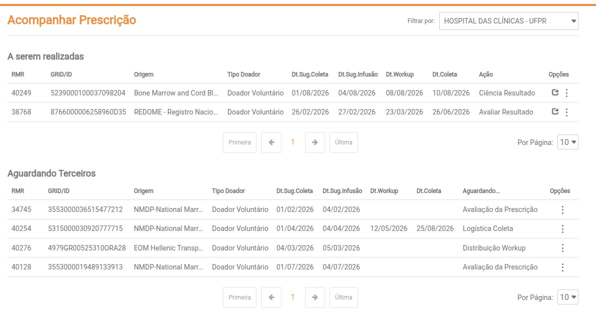 Esta funcionalidade permite ao Médico acompanhar o andamento da prescrição para os seus pacientes. São apresentadas listas indicando as prescrições com situação "A serem realizadas" e “Aguardando terceiros”.