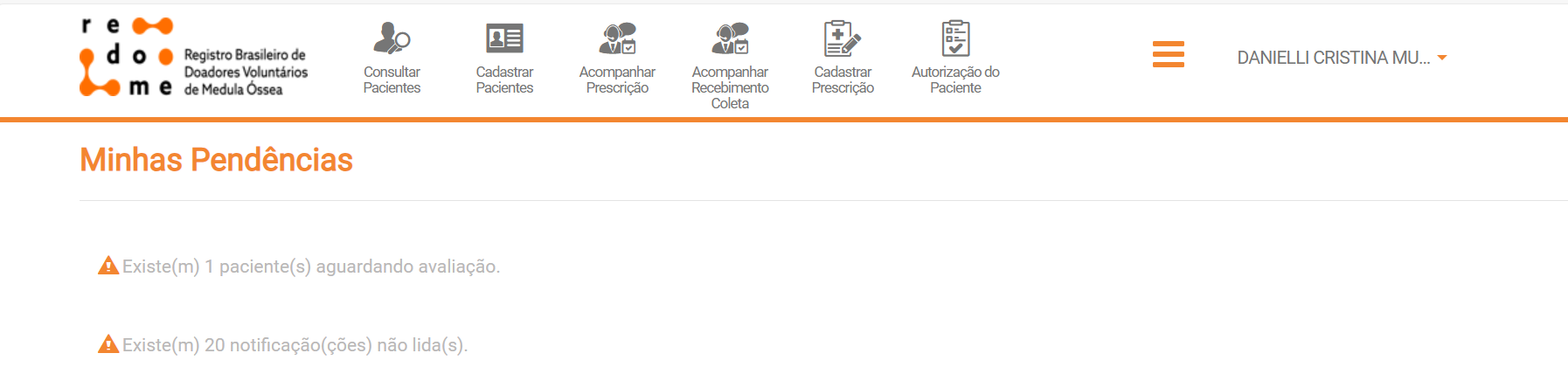 A etapa de Prescrição esta disponível para o Medico atender às prescrições relacionadas ao Workup Importação. Nessa etapa, o Médico ao entrar na tela do Redome terá na tela inicial a lista indicando “Minhas pendências”. Essa lista mostra as atividades abertas e pendentes de uma ação do Médico.